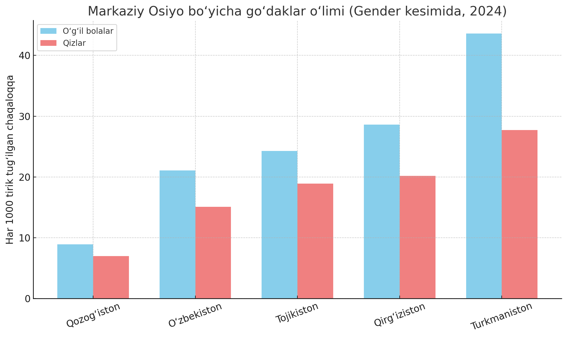 Марказий Осиёда, дунёнинг кўплаб мамлакатларидаги каби, ўғил болалар ўртасида гўдаклар ўлими юқорироқ. Бу эрта туғилиш, иммун тизими ривожланиши ва нафас олишга оид асоратлар билан боғлиқ биологик омиллар билан тушунтирилади.