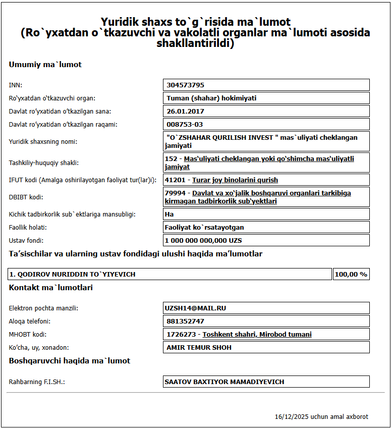 Кейинчалик хусусийлаштирилган ва 2025 йил 16 декабр ҳолатига Қодиров Нуриддин Тўйиевич корхонанинг ягона таъсисчиси ҳисобланади.