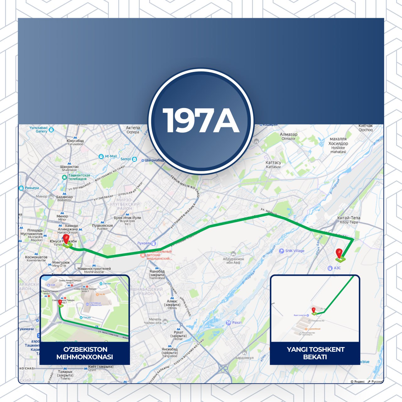 Янги Тошкентдан пойтахтдаги Ўзбекистон меҳмонхонасига қатновчи 197-сонли янги автобус йўналиши ишга туширилди. Йўналишда оқ рангли янги Yutong автобуслари ҳар куни соат 05:30 дан 22:50 гача ҳаракатланади.