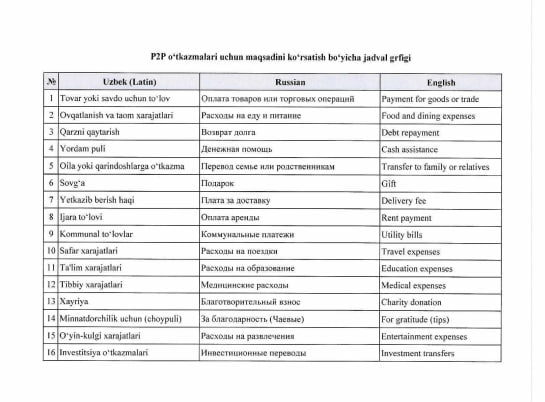 По требованию Центрального банка Узбекистана в мобильных приложениях банков и платёжных организаций введён обязательный порядок указания цели перевода при осуществлении переводов с карты на карту (P2P).