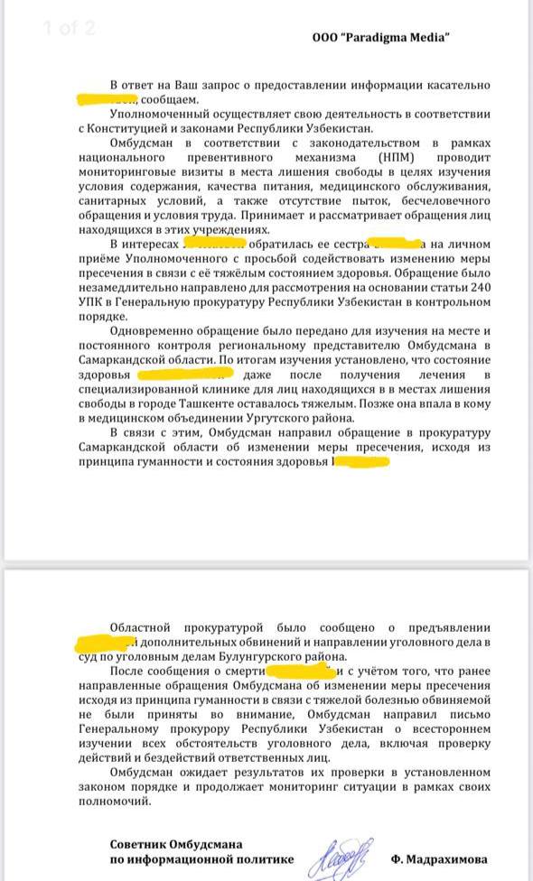 Ответ, предоставленный Омбудсменом на запрос редакции Paradigma.uz